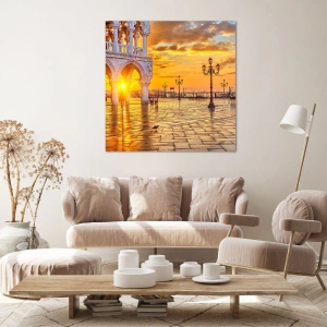 - Un tableau représentant un coucher de soleil doré sur une place de la ville avec des arcades et des lampes, parfait pour les intérieurs pleins de romantisme et d'élégance.