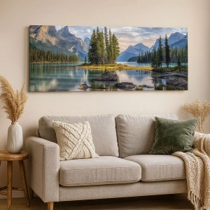 Impression sur toile - Image sur toile - Un paysage de montagne avec une île entourée d'un lac calme - 50x70cm - Sous les grandes eaux claires - Décoration murale moderne pour le salon et la chambre ARTTOR