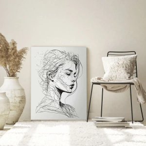- Le tableau représente une subtile esquisse en noir et blanc d'une femme aux yeux clos, exécutée d'un trait délicat. La forme minimaliste et l'expression délicate créent une atmosphère de silence et de réflexion.