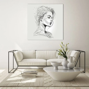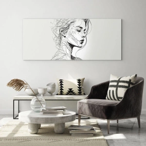 Impression sur verre - Image sur verre - Un croquis en noir et blanc d'une femme aux yeux fermés dans une ligne délicate. - 70x50cm - Portrait en pensée - Décoration murale moderne pour le salon et la chambre ARTTOR