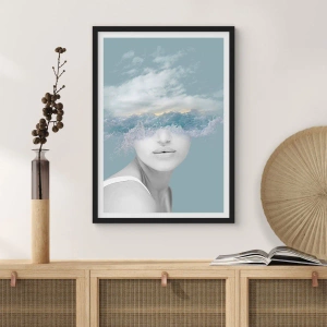 Affiche dans un cadre noir - Poster - Portrait d'une femme avec son visage caché derrière les nuages et les vagues - 70x50cm - La tête dans les nuages - Décoration murale moderne pour le salon et la chambre ARTTOR