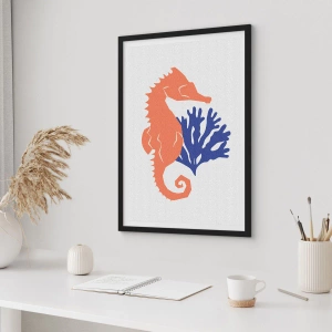 - L'affiche présente un motif stylisé d'hippocampe dans une nuance orange chaleureuse sur fond bleu corail. La forme minimaliste souligne l'élégance et la sérénité de la composition.