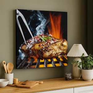 - Un tableau représentant un steak juteux grillé au gril, avec des épices aromatiques et un feu en arrière-plan. Idéal pour les gourmands et une ambiance chaleureuse dans la cuisine ou la salle à manger.