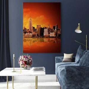 Impression sur verre - Image sur verre - Panorama de la ville au coucher du soleil - 50x70cm - Panorama de grande ville en jaune et bronze - Décoration murale moderne pour le salon et la chambre ARTTOR