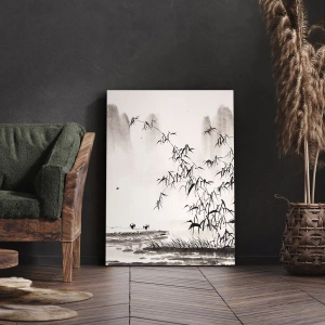 - Un tableau subtil représentant un paysage oriental avec des bambous, un bateau et des montagnes en arrière-plan, conçu dans un style minimaliste. Parfait pour tout intérieur, il apporte paix et harmonie.