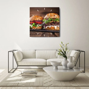 - Délicieux hamburgers garnis sur fond bois. L'horloge idéale pour une cuisine ou un intérieur à thème culinaire.