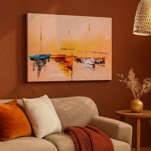 - Des bateaux colorés sur une eau calme au coucher du soleil, la décoration parfaite pour apporter harmonie et chaleur aux intérieurs.