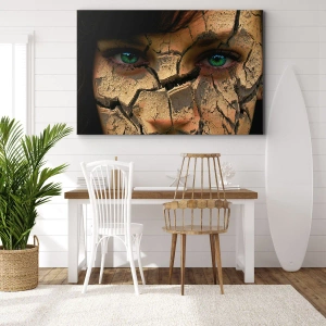 - Une composition artistique représentant un visage de femme aux yeux verts, recouvert d'une texture de terre craquelée. Un tableau empreint de symbolisme, d'inspiration et d'émotion, parfait pour les intérieurs modernes.