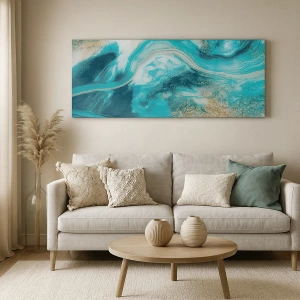 Impression sur toile - Image sur toile - Abstraction turquoise avec des accents blancs et dorés - 100x70cm - Rivière d'or - Décoration murale moderne pour le salon et la chambre ARTTOR