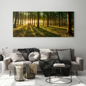 Tableau sur verre « Photographie de toutes les sources » est une scène naturelle incroyablement pittoresque représentant une clairière illuminée par les rayons du soleil levant. De grands arbres majestueux créent un cadre naturel pour la lumière délicate qui se déverse dans la clairière, mettant en valeur la verdure et les détails de la nature environnante. Cette composition inhabituelle plonge le spectateur dans une atmosphère de silence, de paix et d'harmonie.