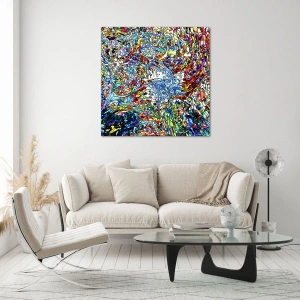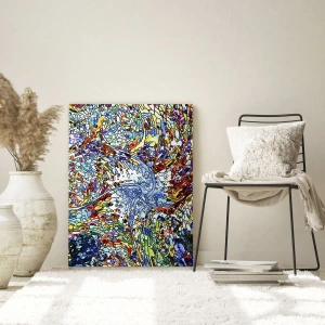 La peinture sur verre est faite sur un verre de 4 mm d'épaisseur. Les bords du verre ont une arête trapézoïdale mate. La tableau est sûr à l'utilisation et prêt à être accroché - il a des crochets en métal attachés à l'arrière du cadre et des entretoises en mousse permettant la régulation uniforme de la distance du tableau au mur.