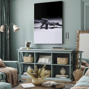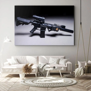 - Ce tableau représente un fusil noir moderne sur un fond sombre. Le style industriel et les détails techniques confèrent à la décoration un caractère distinctif.