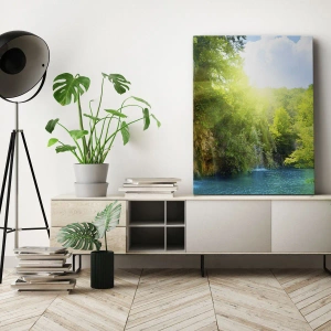 Impression sur toile - Image sur toile - Une cascade se jetant dans un lac turquoise entouré de verdure - 50x70cm - Ce doit être le paradis ici - Décoration murale moderne pour le salon et la chambre ARTTOR