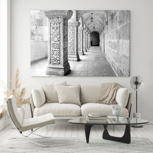 La peinture sur verre est faite sur un verre de 4 mm d'épaisseur. Les bords du verre ont une arête trapézoïdale mate. La tableau est sûr à l'utilisation et prêt à être accroché - il a des crochets en métal attachés à l'arrière du cadre et des entretoises en mousse permettant la régulation uniforme de la distance du tableau au mur.