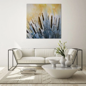 Impression sur verre - Image sur verre - Quenouilles peintes contre un ciel ensoleillé - 50x70cm - Fraicheur de l'eau, chaleur du soleil - Décoration murale moderne pour le salon et la chambre ARTTOR