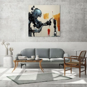 Impression sur verre - Image sur verre - Un robot peignant une main mécanique sur un fond abstrait. - 70x50cm - Déjà demain… - Décoration murale moderne pour le salon et la chambre ARTTOR
