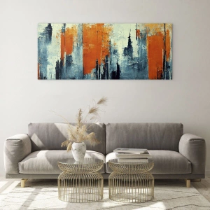 Impression sur verre - Image sur verre - Un panorama urbain moderne dans des tons de gris et d'orange - 50x70cm - Paysage moderne - Décoration murale moderne pour le salon et la chambre ARTTOR