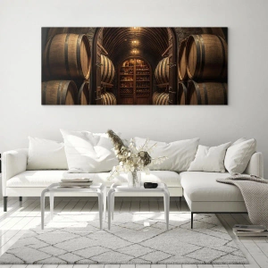 Impression sur verre - Image sur verre - Un vignoble avec des barriques et une cave éclairée pleine de bouteilles - 100x70cm - Cave climatisée - Décoration murale moderne pour le salon et la chambre ARTTOR