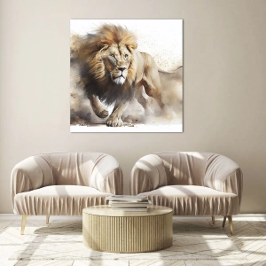 Impression sur verre - Image sur verre - Une photo dynamique de style aquarelle d'un lion en train de courir - 50x70cm - Le roi bougea - Décoration murale moderne pour le salon et la chambre ARTTOR
