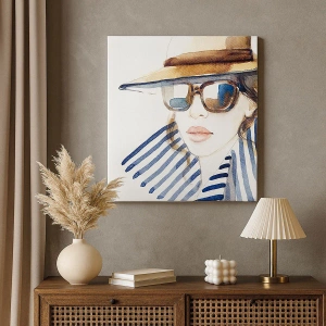 • Un élégant portrait de femme portant un chapeau et de larges lunettes de soleil. Réalisé dans un style aquarelle, avec de subtiles nuances de bleu et de blanc, ce tableau s'intègre parfaitement à tout intérieur moderne.