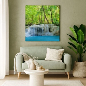 Impression sur toile - Image sur toile - Une cascade parmi des arbres verts avec de l'eau bleue dans un cadre naturel - 120x80cm - Se noyer dans le turquoise et le vert - Décoration murale moderne pour le salon et la chambre ARTTOR