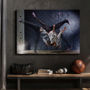 « Street Star » est une impression sur toile représentant une scène de danse dynamique avec un danseur en plein mouvement. Capturée en train de sauter contre un mur de briques et sous un éclairage intense, l'image capture l'énergie, le rythme et l'expression de la danse de rue. Les effets visuels soulignent le mouvement, créant une sensation de fluidité et de légèreté.