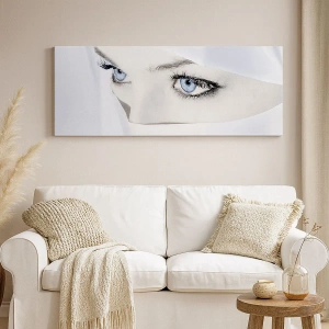 Impression sur toile - Image sur toile - Portrait d'une femme aux yeux bleus cachés derrière un voile blanc - 160x50cm - Directement des mille et une nuits - Décoration murale moderne pour le salon et la chambre ARTTOR