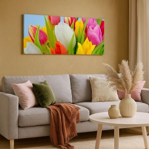Impression sur toile - Image sur toile - Un arc-en-ciel fleuri en gouttes de rosée - 90x30 cm