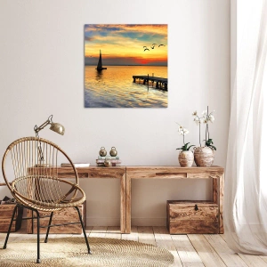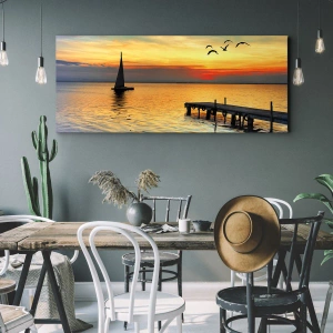 L'impression sur toile « Retour du soir » est une décoration unique qui nous transporte dans un monde de paix et de tranquillité. Elle représente un coucher de soleil pittoresque sur un lac calme, où un voilier dérive paresseusement sur l'eau. Au premier plan, une jetée en bois semble nous inviter à la détente et à la contemplation. Des oiseaux planent au-dessus de l'eau, et les couleurs chaudes du ciel se mêlent aux reflets à la surface du lac.