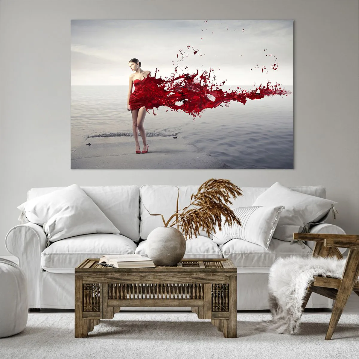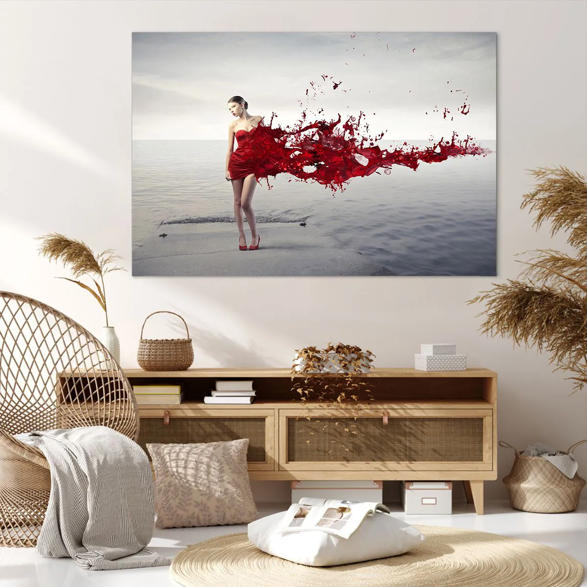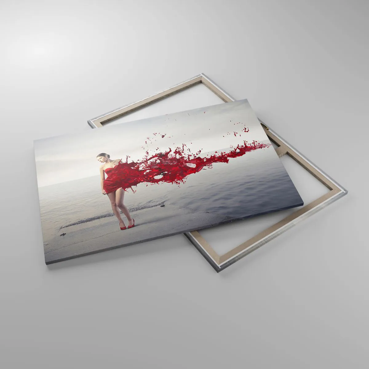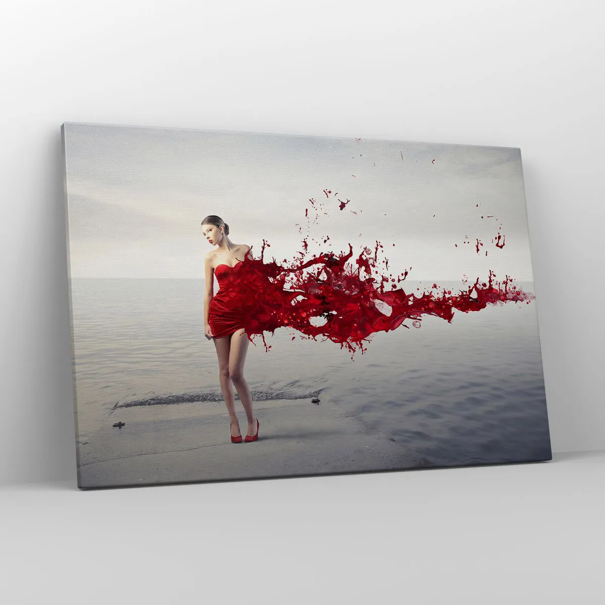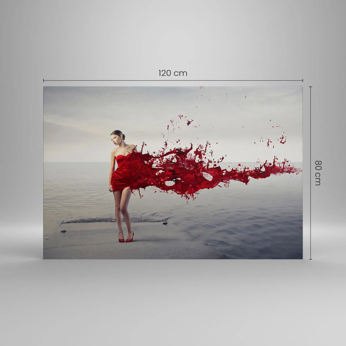 Impression sur toile - Image sur toile - Une femme en robe rouge dans une composition artistique au bord de l'eau - 120x80cm - Passionné comme l'écarlate - Décoration murale moderne pour le salon et la chambre ARTTOR