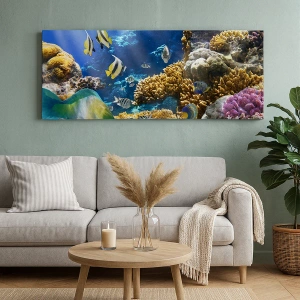 Impression sur toile - Image sur toile - Un récif corallien coloré avec des poissons tropicaux dans les profondeurs de l'océan. - 140x50cm - Beaucoup de circulation sur la route des vacances - Décoration murale moderne pour le salon et la chambre ARTTOR