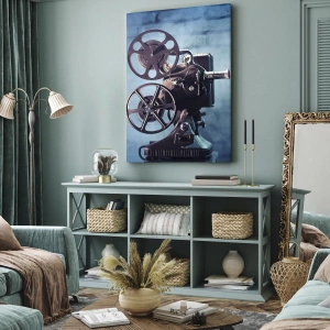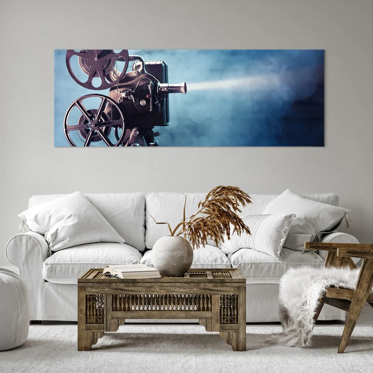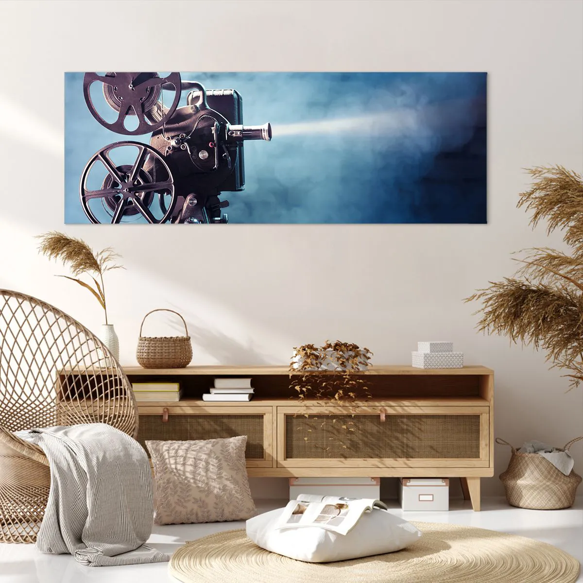 Impression sur toile - Image sur toile - Un vieux projecteur de cinéma projetant de la lumière sur un fond bleu - 140x50cm - Dans un vieux cinéma - Décoration murale moderne pour le salon et la chambre ARTTOR
