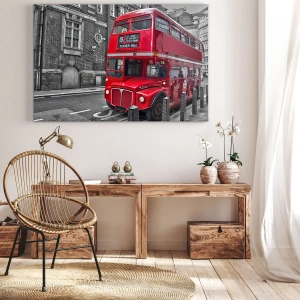 - Ce tableau représente un bus rouge à impériale à Londres sur fond d'architecture classique. C'est la décoration idéale pour les amateurs de style britannique et de paysages urbains.