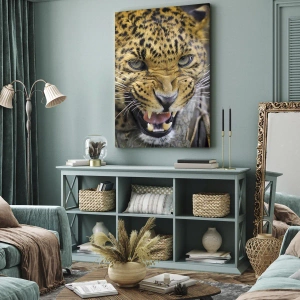 • Gros plan d'un léopard menaçant, crocs dénudés et regard intense. L'image capture la férocité et la majesté de ce prédateur, parfait pour les intérieurs modernes.