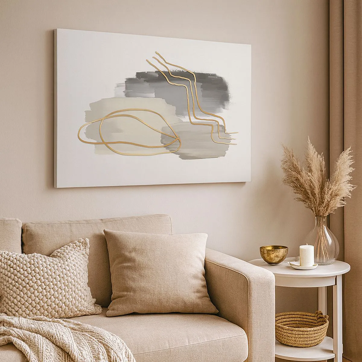 - Un tableau au caractère moderne représentant des lignes dorées sur fond gris, parfait pour les intérieurs minimalistes et élégants.