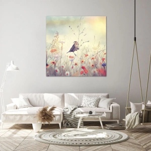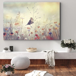 Impression sur toile - Image sur toile - Un oiseau sur fond de prairie colorée aux couleurs pastel - 120x50cm - Portrait d'oiseau sur pré en fond - Décoration murale moderne pour le salon et la chambre ARTTOR