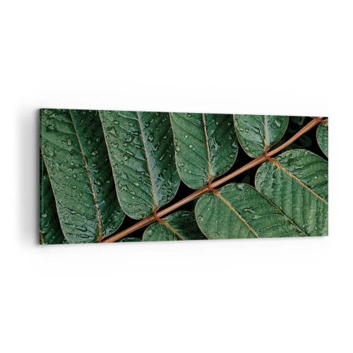 Impression sur toile - Image sur toile - Macro shot de feuilles vertes avec des gouttes de rosée - 120x50cm - Au rythme de la verdure - Décoration murale moderne pour le salon et la chambre ARTTOR