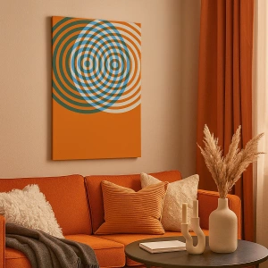 - Ce design moderne présente des cercles concentriques sur un fond aux nuances d'orange, de bleu et de vert. Il est parfait pour les intérieurs modernes et minimalistes.