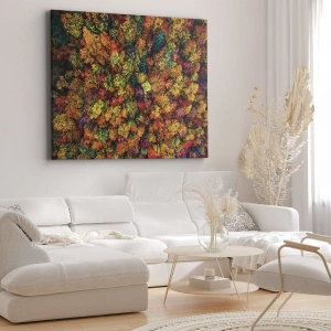 - L'impression sur toile « Bouquet d'arbres d'automne » présente une vue panoramique pittoresque des cimes colorées des arbres dans une palette automnale. Parfaite pour les intérieurs en quête de paix et d'harmonie.