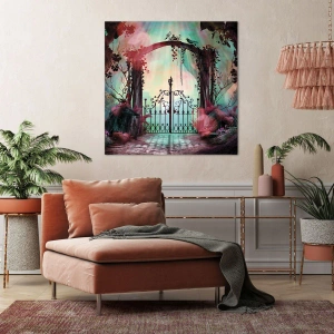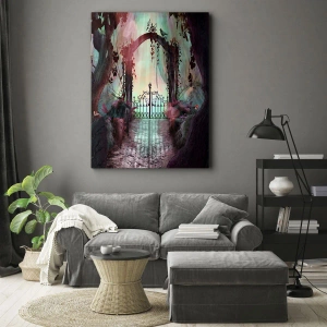 • Cette toile imprimée de 70 x 50 cm représente une entrée magique avec un portail en fer forgé, entourée d'une végétation luxuriante et colorée. Une décoration unique qui crée une atmosphère mystérieuse et fantastique.