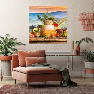 Impression sur toile - Image sur toile - Une composition de fromages et de fruits sur fond de paysage toscan - 100x70cm - La joie de vivre à l'italienne - Décoration murale moderne pour le salon et la chambre ARTTOR