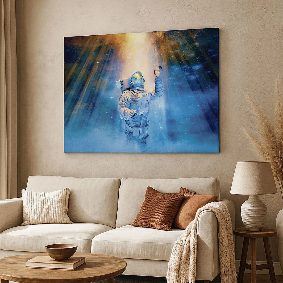 - Cette toile imprimée 70x50 cm représente un astronaute entouré de lumière cosmique et d'une explosion d'étoiles. C'est la décoration idéale pour les amoureux de l'espace et du design moderne.