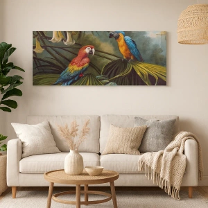 - Cette toile colorée de 70 x 50 cm représente des perroquets dans une forêt tropicale sur fond de fleurs exotiques. Parfaite pour tout intérieur, elle apporte une atmosphère tropicale et une harmonie unique.