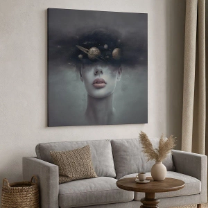 Impression sur toile - Image sur toile - Un visage de femme avec un motif de planète et d'espace en arrière-plan - 120x50cm - Et les planètes deviennent folles... - Décoration murale moderne pour le salon et la chambre ARTTOR