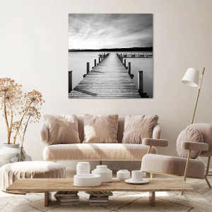 Impression sur toile - Image sur toile - Une jetée noire et blanche sur un lac calme - 120x80cm - Au point d'eau - la paix - Décoration murale moderne pour le salon et la chambre ARTTOR