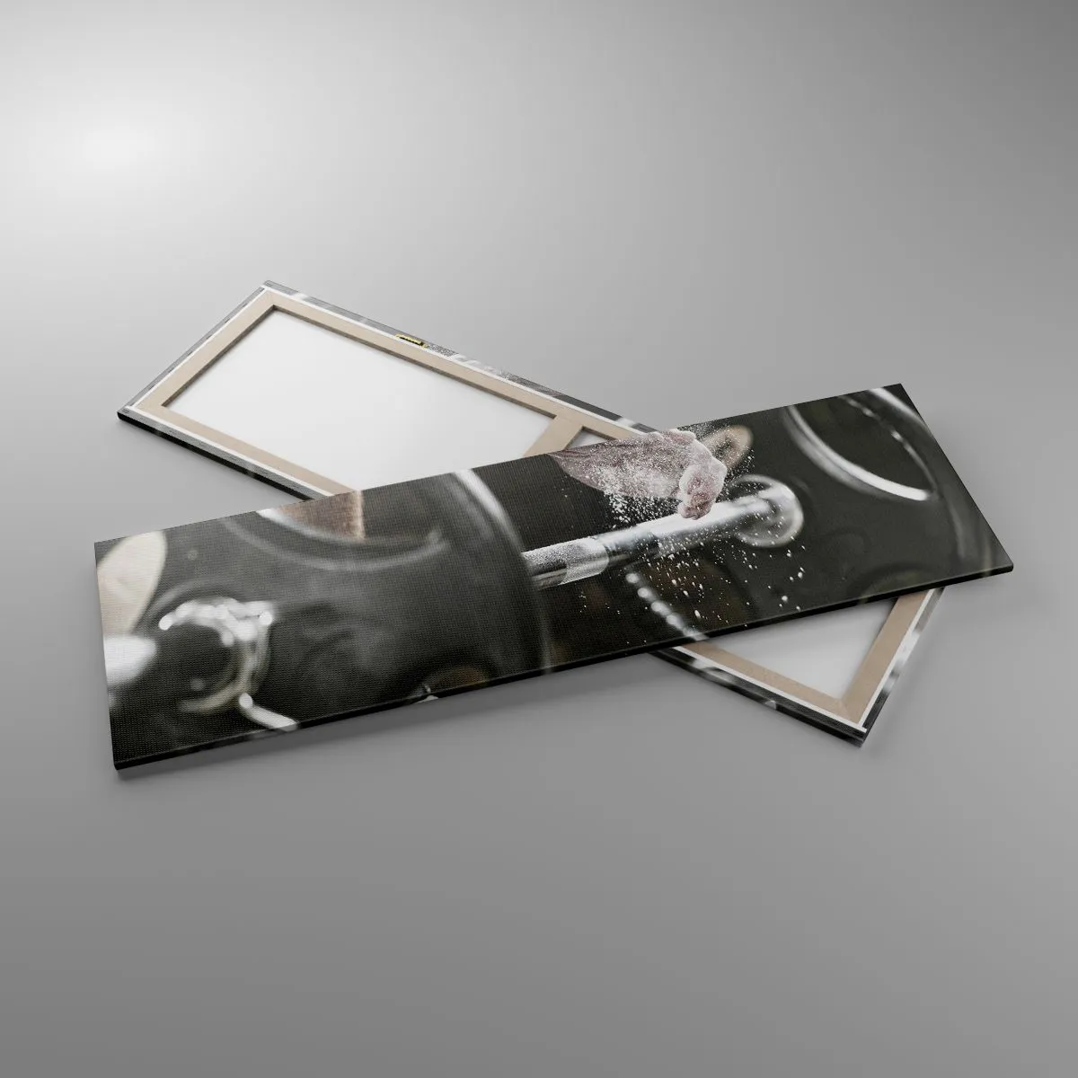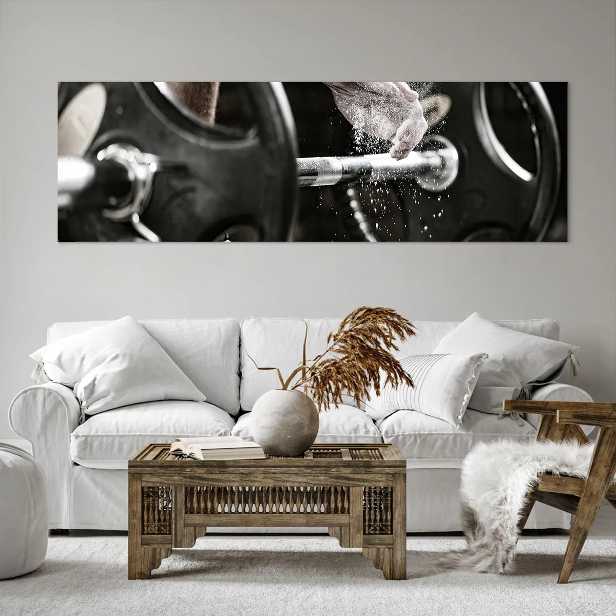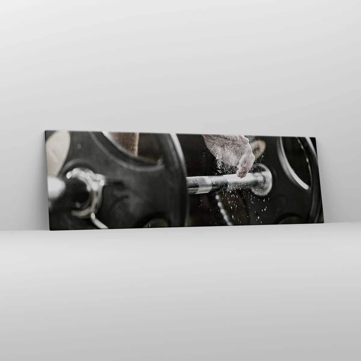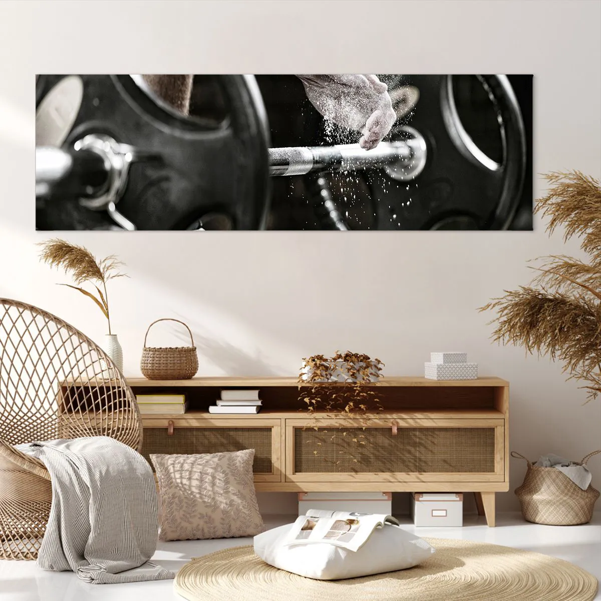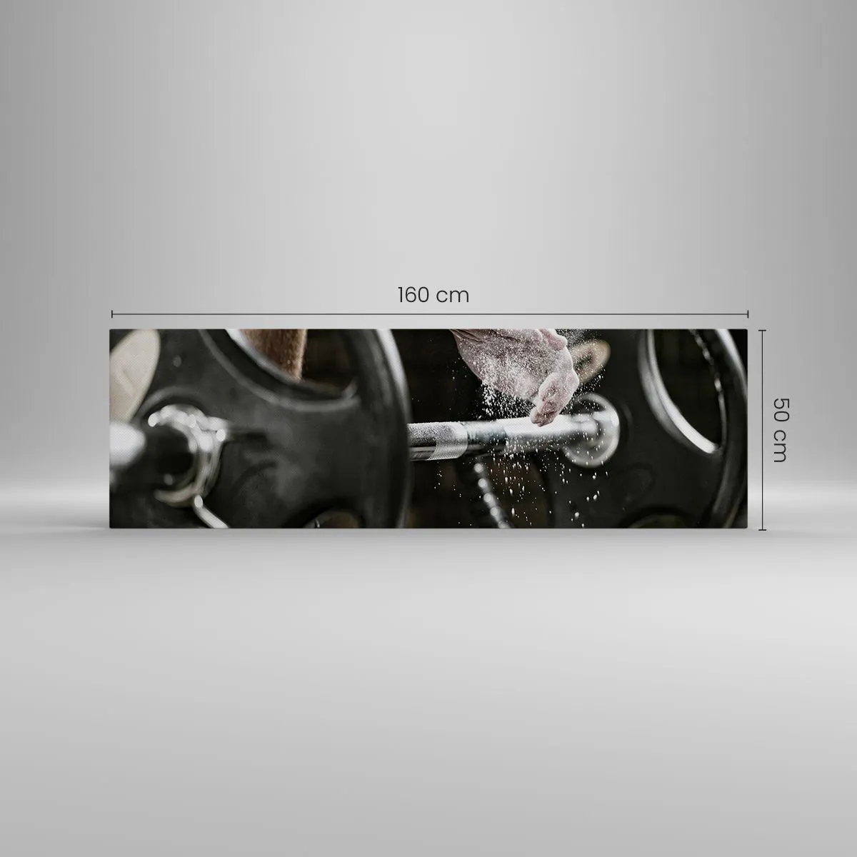 Impression sur toile - Image sur toile - Des haltères et les mains d'un athlète se préparant à l'entraînement - 160x50cm - Défi accepté! - Décoration murale moderne pour le salon et la chambre ARTTOR