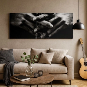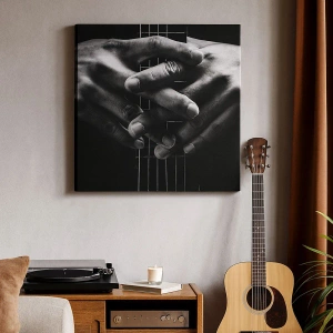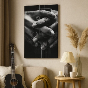 • Représentation en noir et blanc de mains jointes posées sur une guitare. Ce tableau à l'expression unique s'intègre parfaitement aux intérieurs harmonieux et raffinés. Une magnifique décoration pour un salon, une chambre ou un bureau.