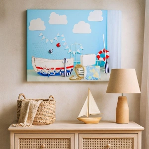 « Envie d'aventure d'un enfant » est une peinture sur toile représentant une charmante décoration nautique avec un bateau, des filets de pêche et d'autres accessoires nautiques sur fond de ciel bleu et de nuages blancs. La composition dégage une légèreté et une ambiance de vacances, s'intégrant parfaitement aux intérieurs de style nautique. Le tableau mesure 70 x 50 cm.