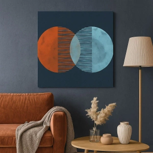 - Le tableau représente deux cercles orange et bleu sur un fond sombre. Une composition minimaliste et artistique, parfaite pour les intérieurs modernes, privilégiant contraste et harmonie.