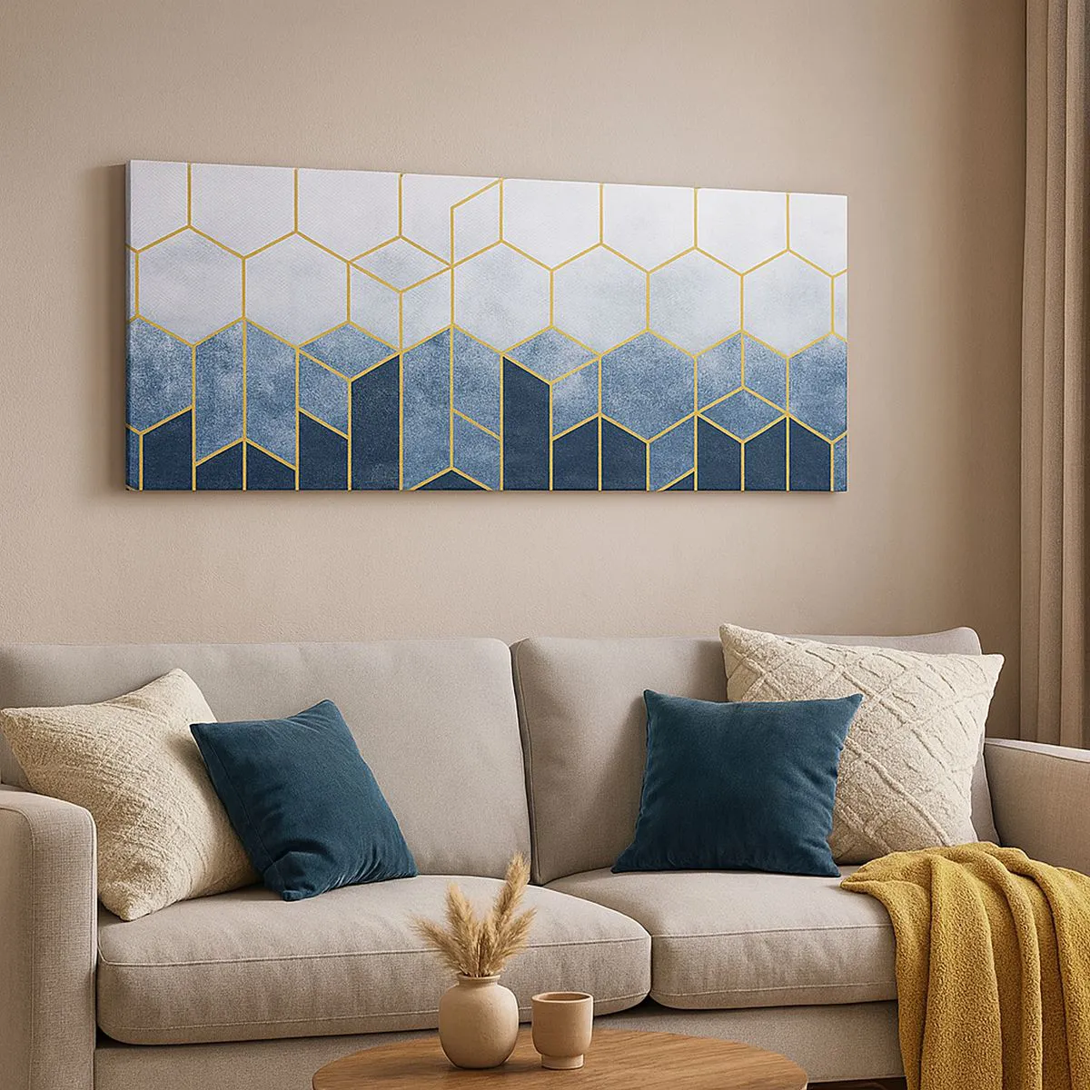 Impression sur toile - Image sur toile - Motif géométrique dans les tons or et bleu marine - 160x50cm - Composition en rythme syncopé - Décoration murale moderne pour le salon et la chambre ARTTOR
